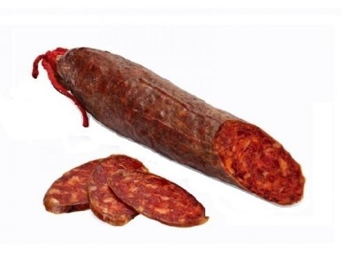 Magro de cerdo Ibérico. Adobada con sal marina, pimentón de la Vera, ajo y orégano. Embutida en tripa natural o artificial, en su fase de curación pasará por una campana de madera donde arde muy lentamente carbón de encina para darle su aroma y sabor característico, posteriormente permanecerá en secaderos naturales un mínimo de 3 meses.