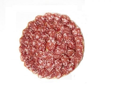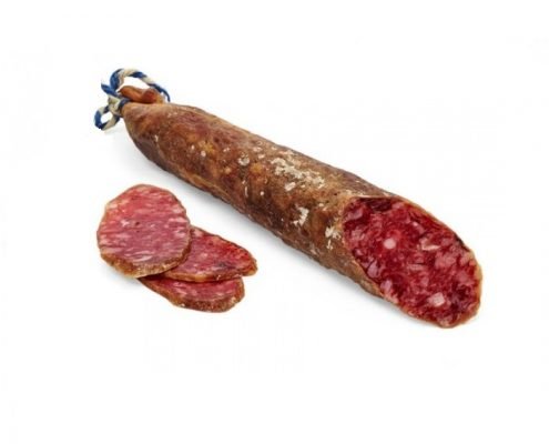 Magro de cerdo Ibérico. Adobada con sal marina, nuez moscada, pimenta molida, pimienta en grano y vino blanco. Embutida en tripa natural o artificial, en su fase de curación pasará por una campana de madera donde arde muy lentamente carbón de encina para darle su aroma y sabor característico, posteriormente permanecerá en secaderos naturales un mínimo de 3 meses.