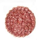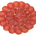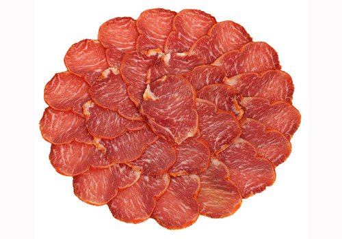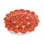 Presa de cerdo Ibérico. Adobada con sal marina, pimentón de la Vera, ajo y orégano. Embutida en tripa natural o artificial, en su fase de curación pasará por una campana de madera donde arde muy lentamente carbón de encina para darle su aroma y sabor característico, posteriormente permanecerá en secaderos naturales un mínimo de 3 meses.