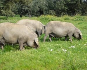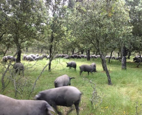 En esta finca nos ocupamos del cuidado de las madres 100% Ibéricas, todas ellas inscritas en el Libro Genealógico de AECERIBER “Asociación de Criadores de Porcino Selecto del Tronco Ibérico” desde su cubrición, de monta natural, parto y cría de los lechones. Estos pastaran en libertad aprovechando los recursos del campo para favorecer su crecimiento y desarrollo.